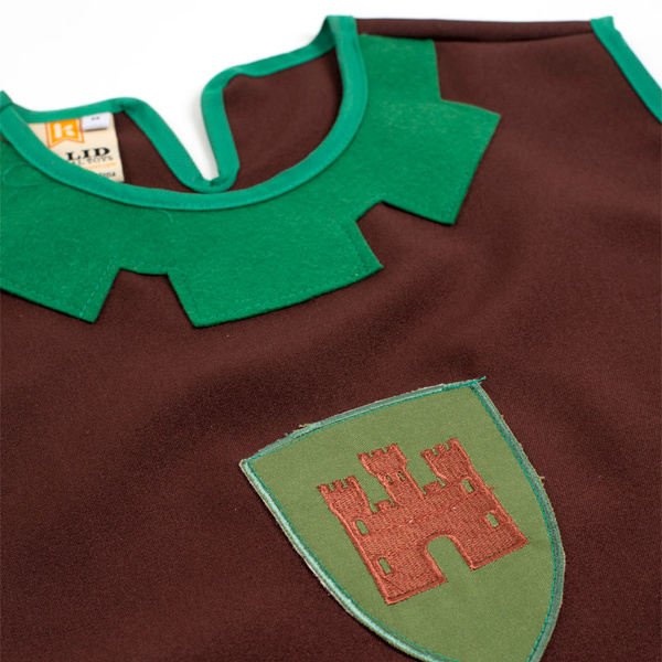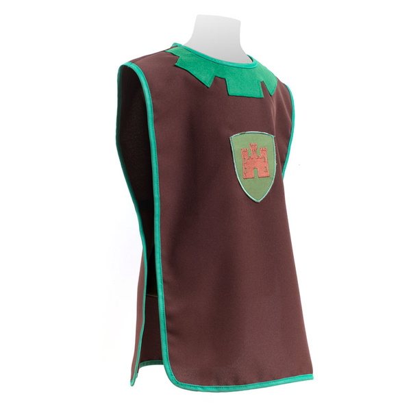 Średniowieczny tabard rycerski wykonany z poliestru, z lamówką z taśmy i filcowym kołnierzem, bardzo wygodny w noszeniu. Z przodu naszyta tarcza z haftowanym smokiem. Należy do brązowej kolekcji Camelot.