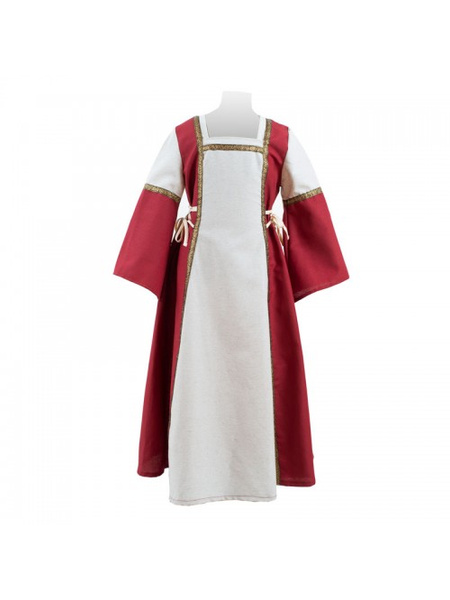 Suknia średniowieczna wykonana w 70% z bawełny, ozdobiona piękną wstążką, która zapewni dziewczynkom i kobietom elegancję. Kolor beżowo-bordowy. Posiada sznurki po bokach, które pozwalają dopasować suknię do ciała. Dostępna w 5 rozmiarach: XS (3-4 lata), S (5-6 lat), M (7-9 lat), L (10-12 lat) i XL (rozmiar dla dorosłych).