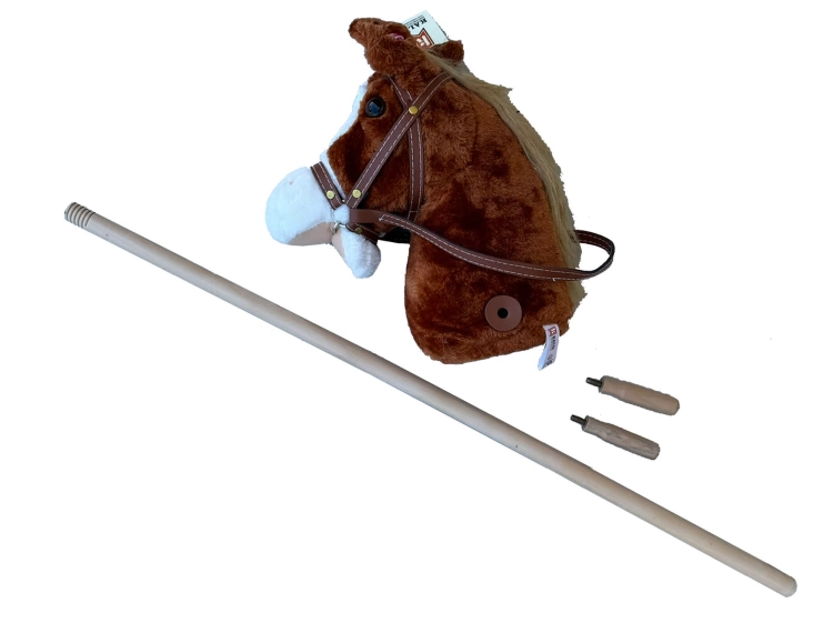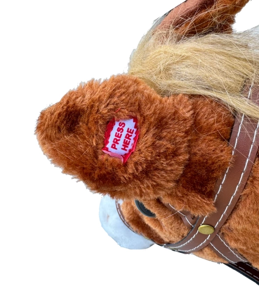 Bardzo miękki pluszowy koń na kiju. Po naciśnięciu ucha wydaje dźwięk rżenia.